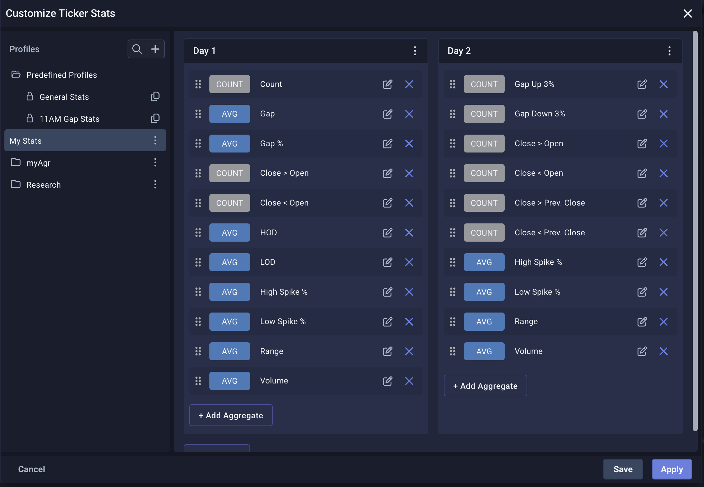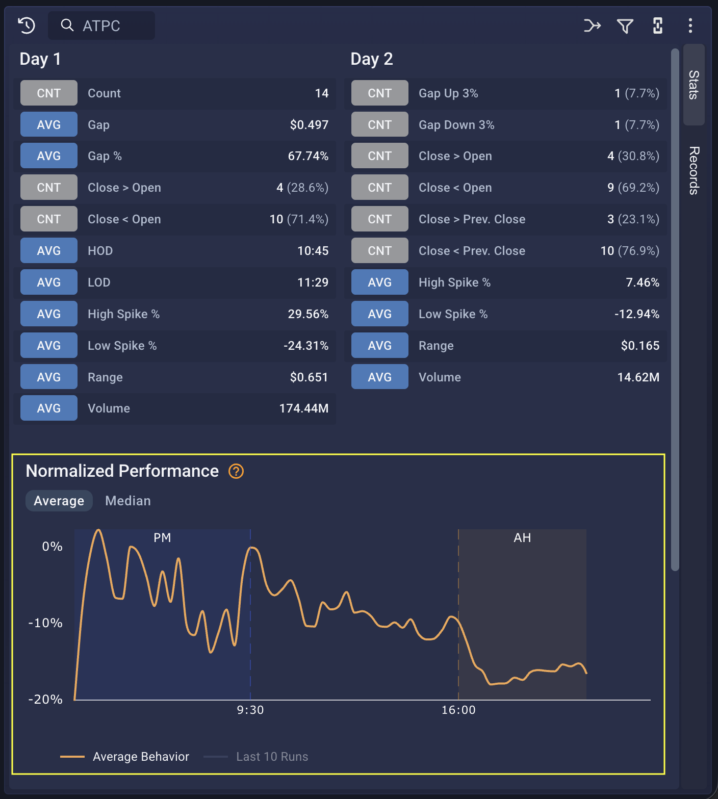 - The Avg. Behavior line represents the average or median of all instances where a stock met this criteria, while the Last 10 Runs displays the last 10 occurrences that satisfied the filter criteria.