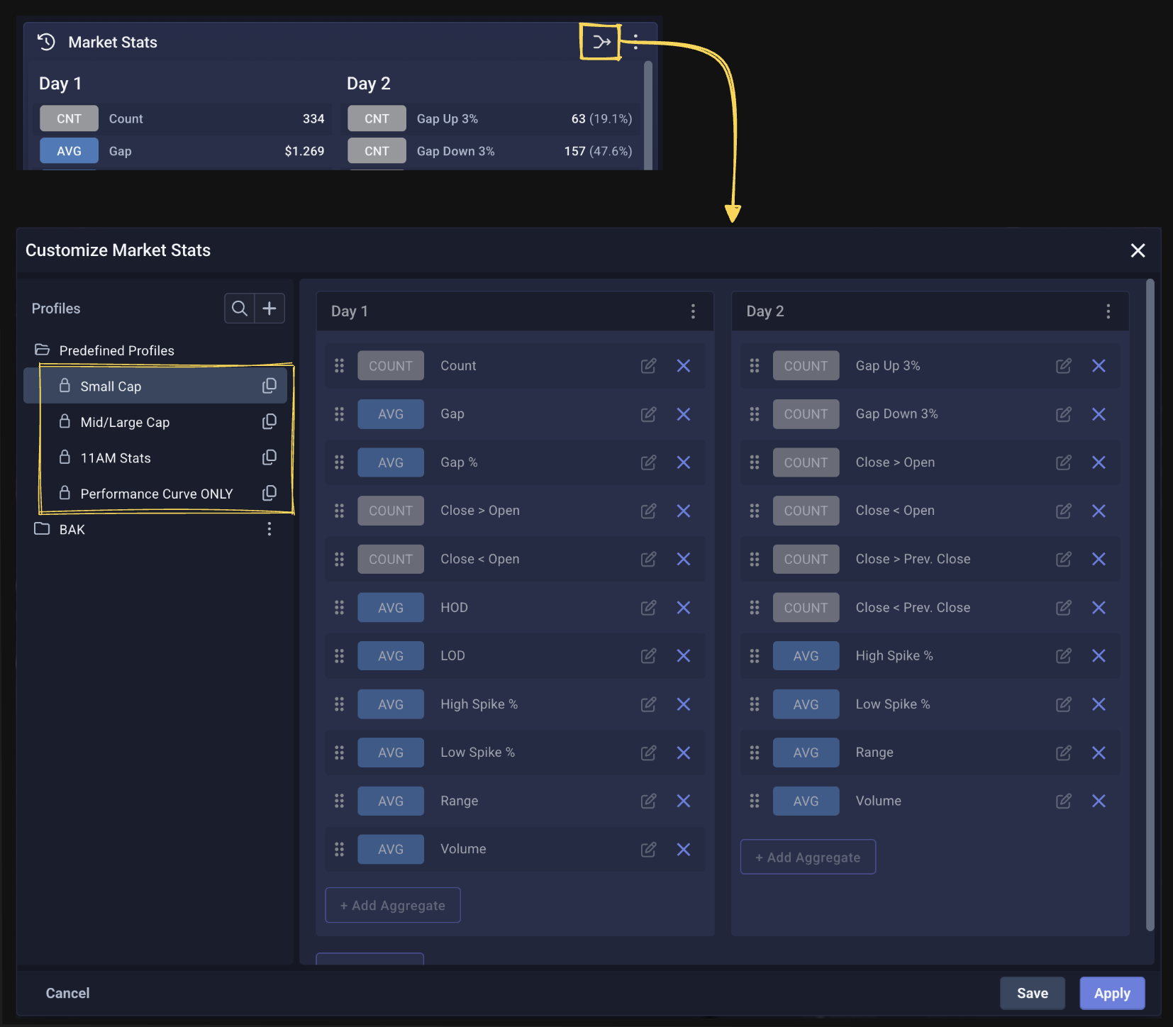 The Avg. Behavior line represents the average or median of all instances where a stock met this criteria, while the Last 10 Runs displays the last 10 occurrences that satisfied the filter criteria.
